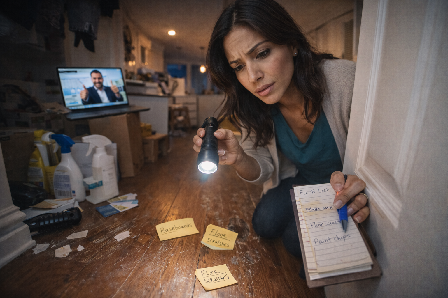 Write down: smells, scratches, dark corners, sticky handles, and weird vibes.